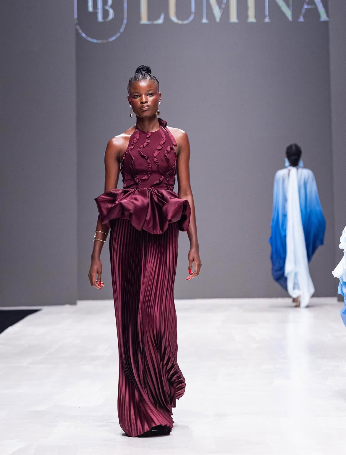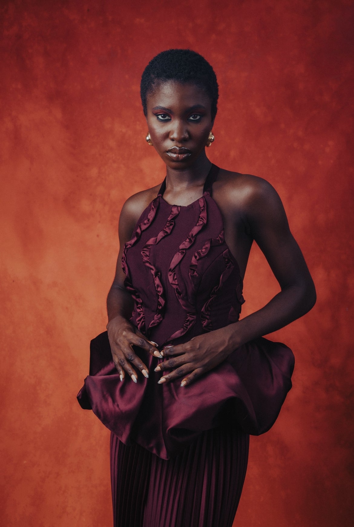 The Ameerah Dress epitomizes black-tie sophistication through its meticulously engineered construction. Crafted from a custom crepe-satin blend, this maxi silhouette features a commanding halter neckline paired with a daring low back that creates dramatic contrast. Luxurious pleating throughout the skirt provides movement and dimension, while a structured balloon peplum at the waist adds architectural interest and refined volume. This piece represents the pinnacle of formal elegance—designed for those who appreciate impeccable tailoring, bold design choices, and timeless evening wear that makes an unforgettable statement.
