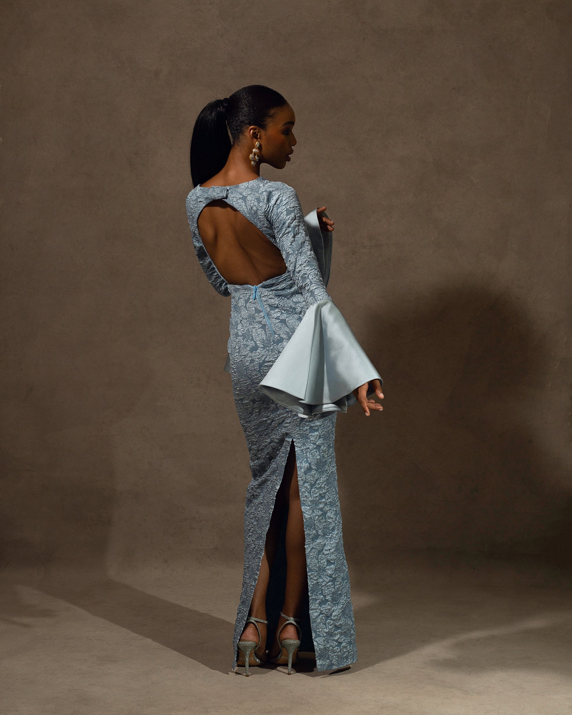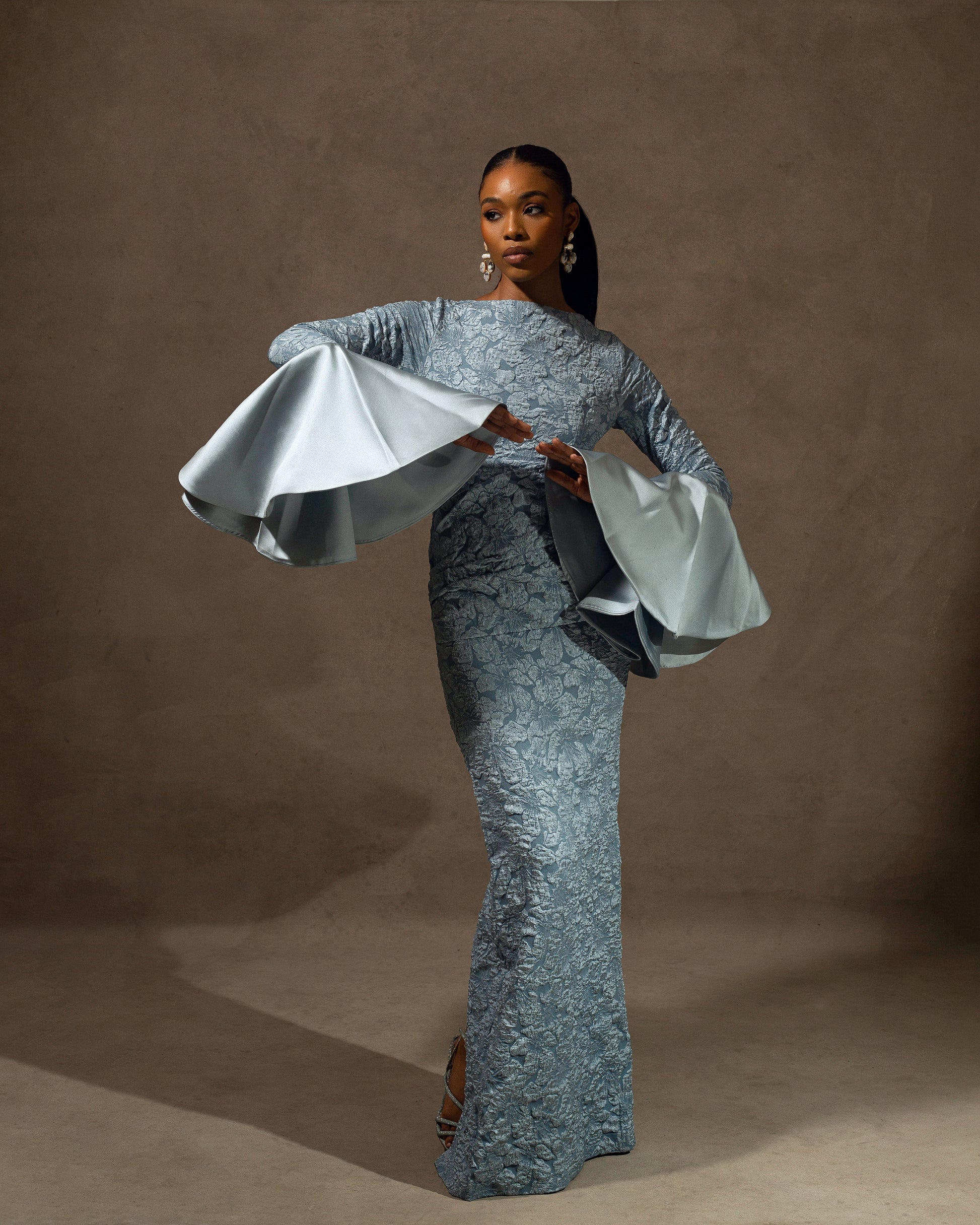 The Ariella dress. A sophisticated maxi dress with flared wrists. This dress can be worn to wedding, red carpet, balls or any occasion