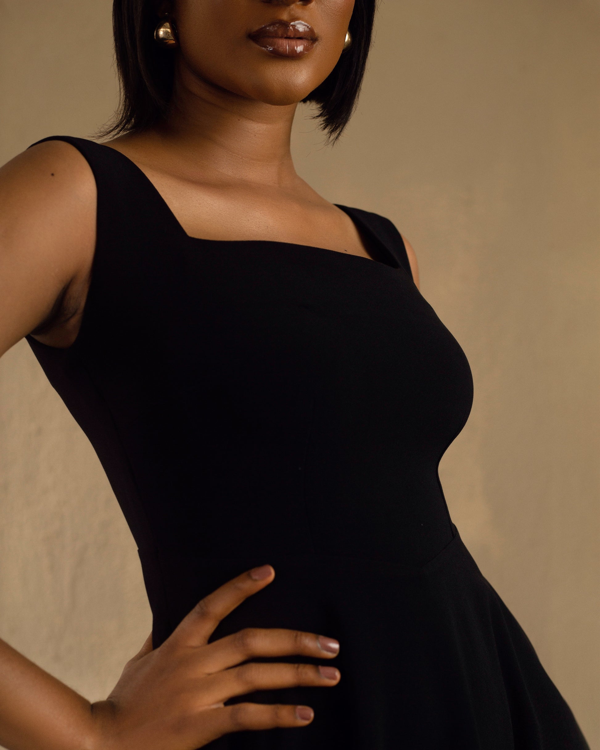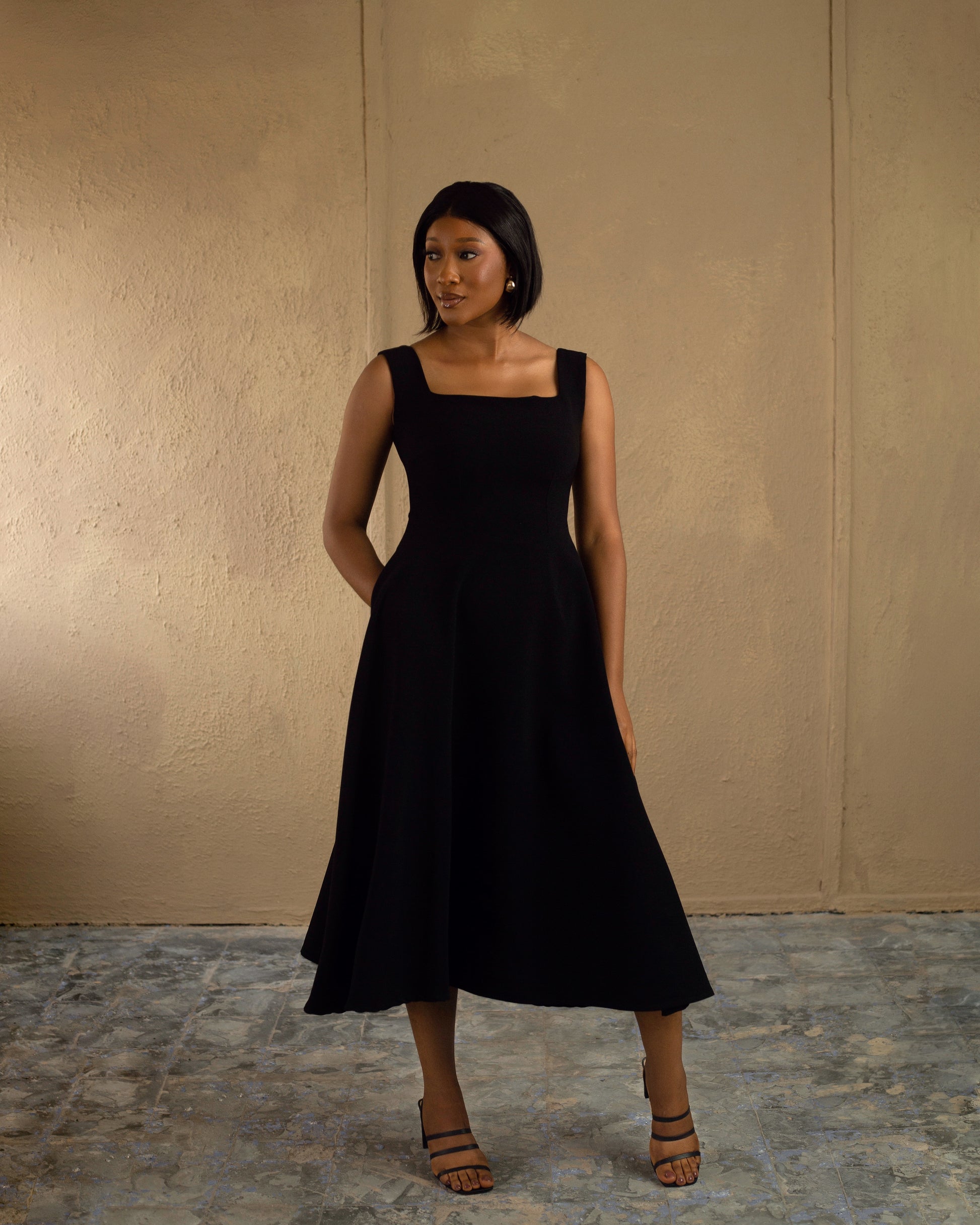 Essential Square Neck Flared Sleeveless Midi Dress Black