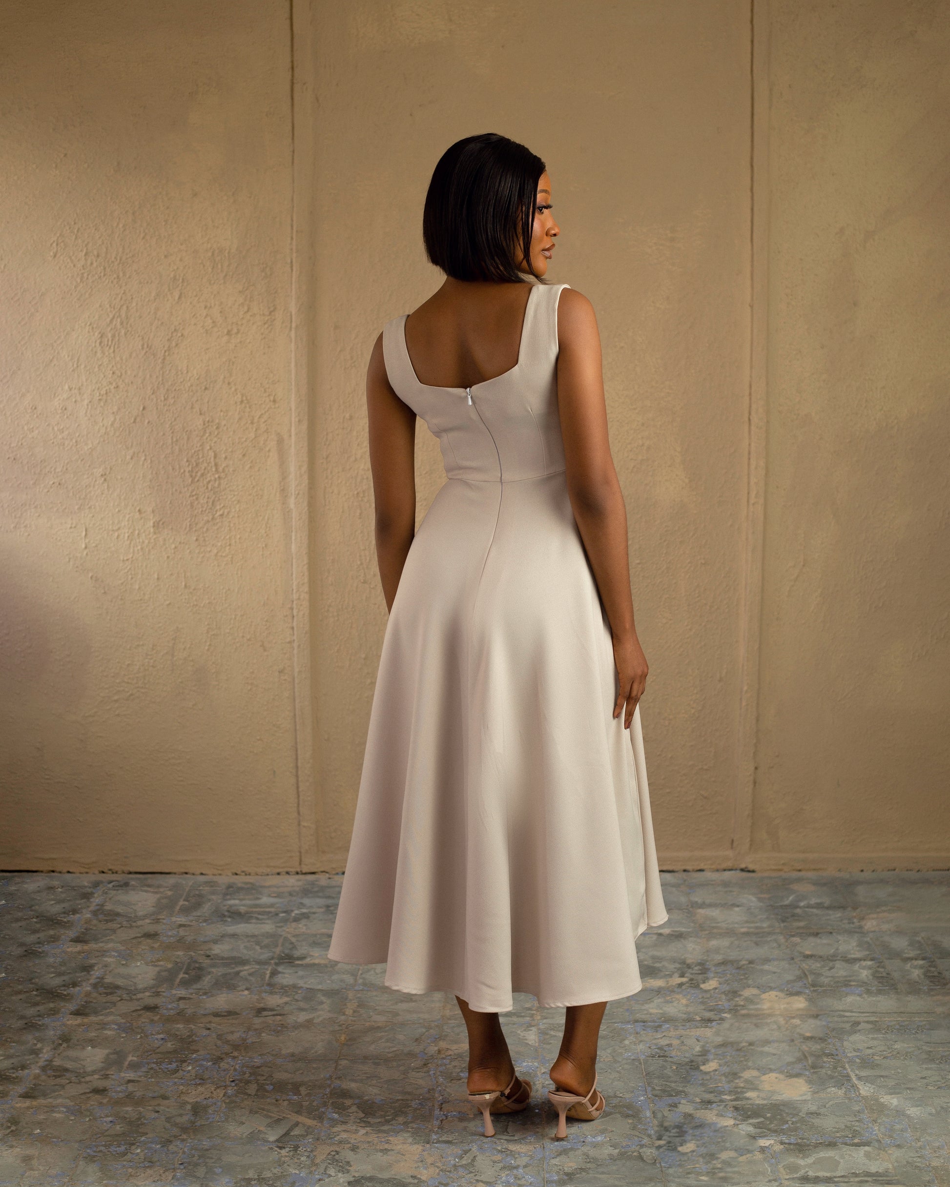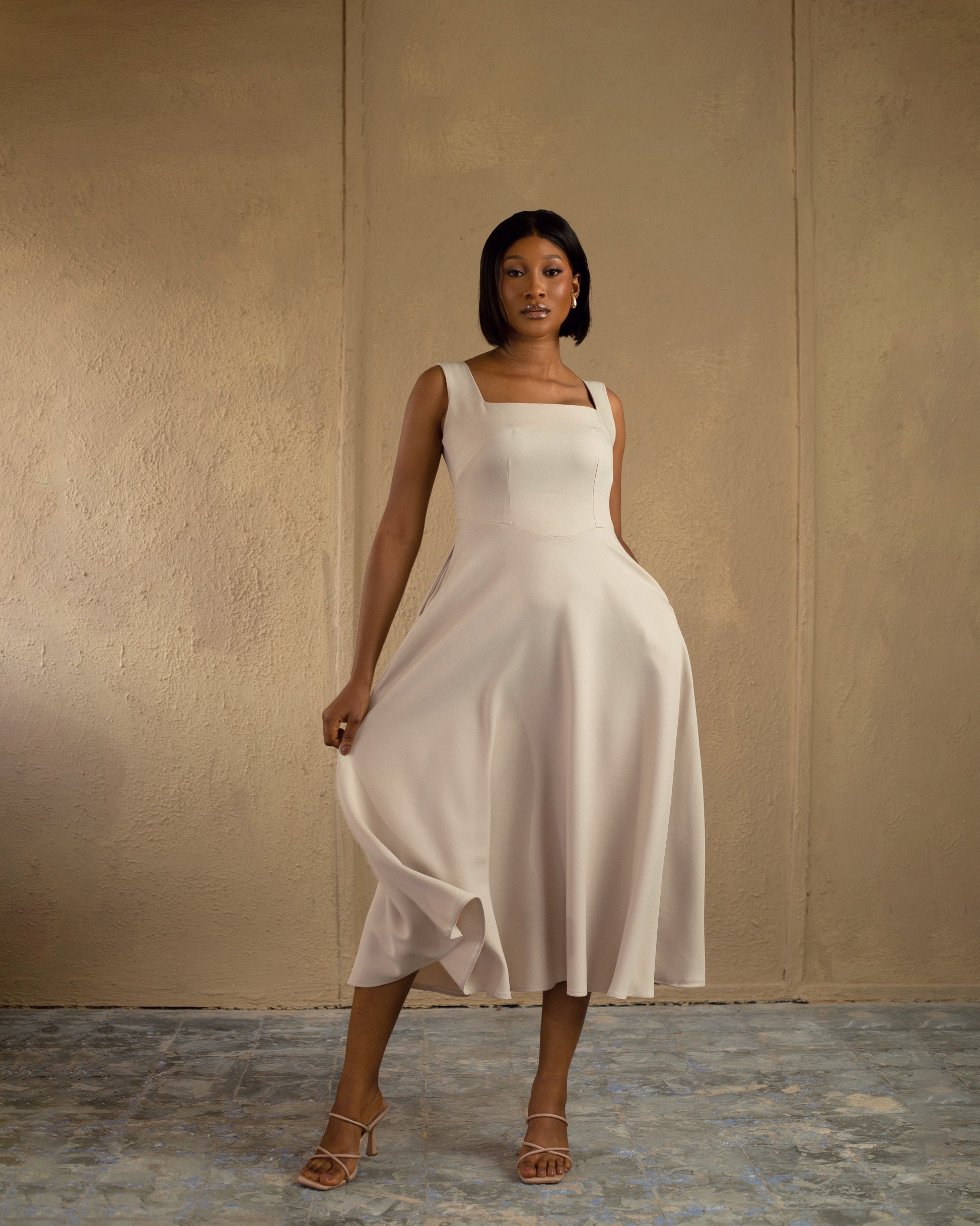 Essential Square Neck Flared Sleeveless Midi Dress Ecru