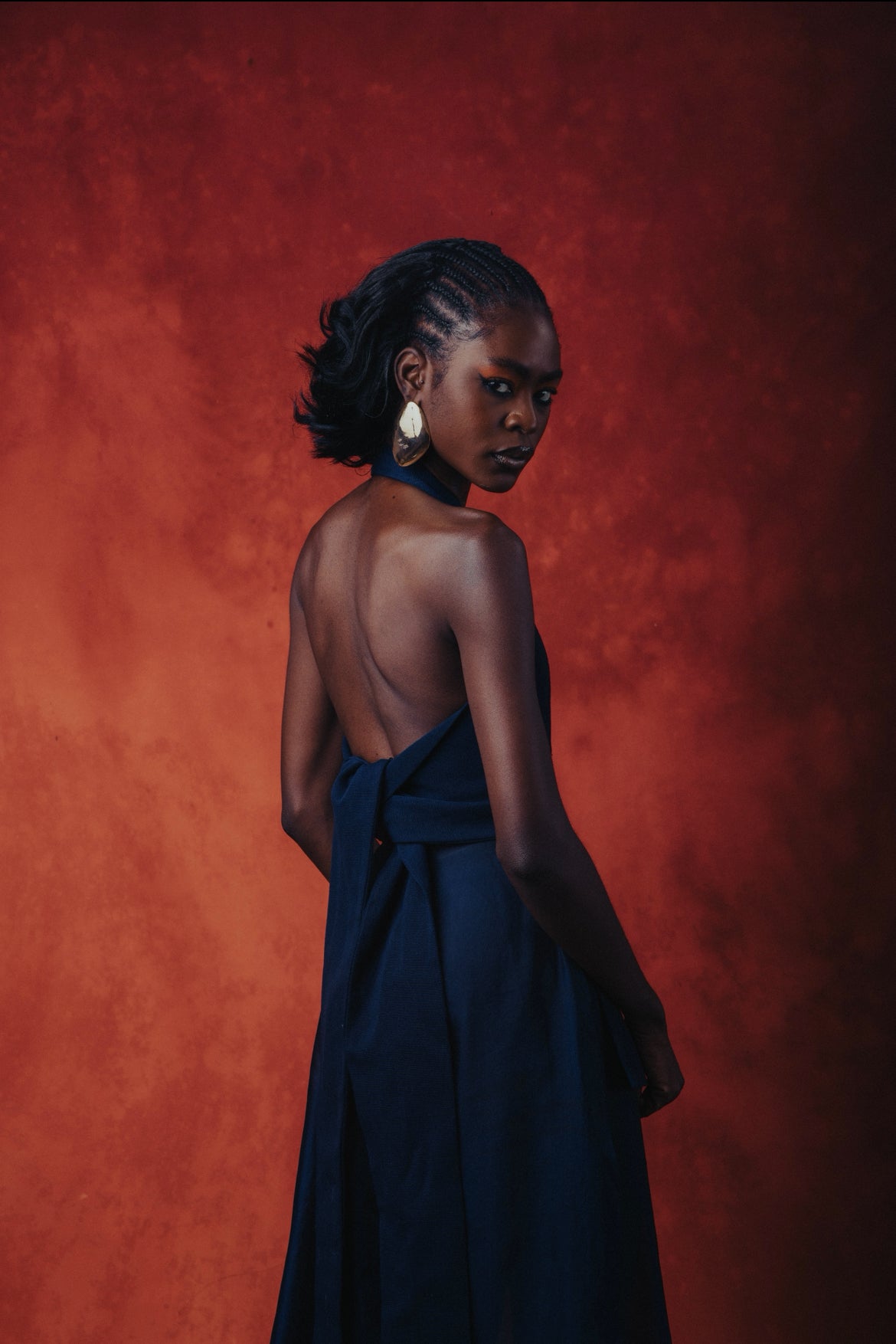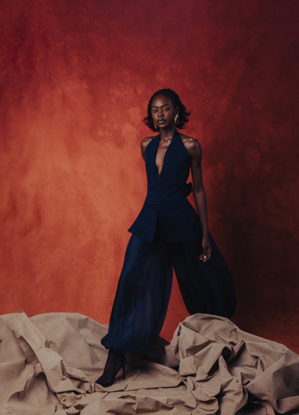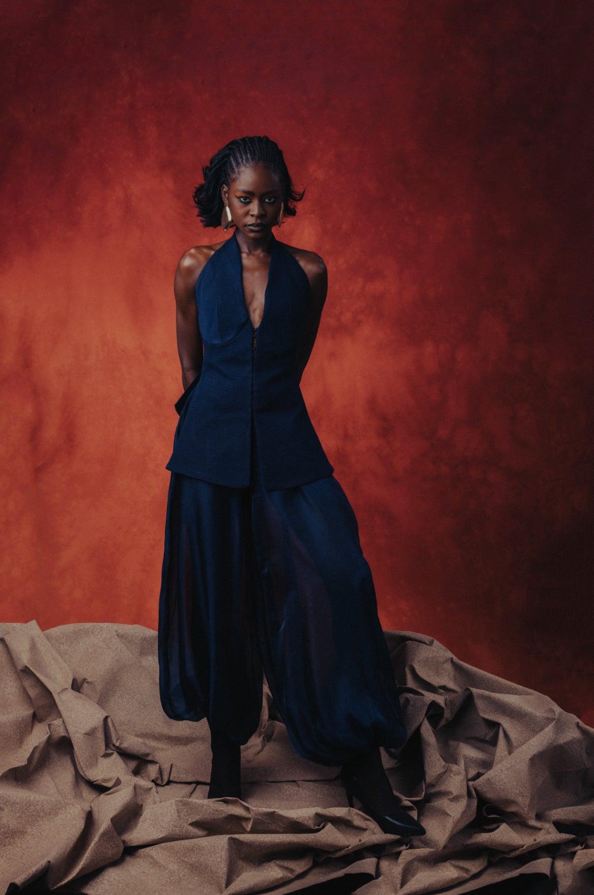 The Lewa Set combines traditional elegance with contemporary silhouette. This ensemble features a structured halter aso oke top that showcases intricate woven patterns, paired with ethereal sheer organza balloon pants that create graceful volume and movement. The contrast between the bold, textured top and delicate, flowing pants makes this a sophisticated choice for special occasions. Perfect for those seeking to blend cultural heritage with modern fashion sensibility.