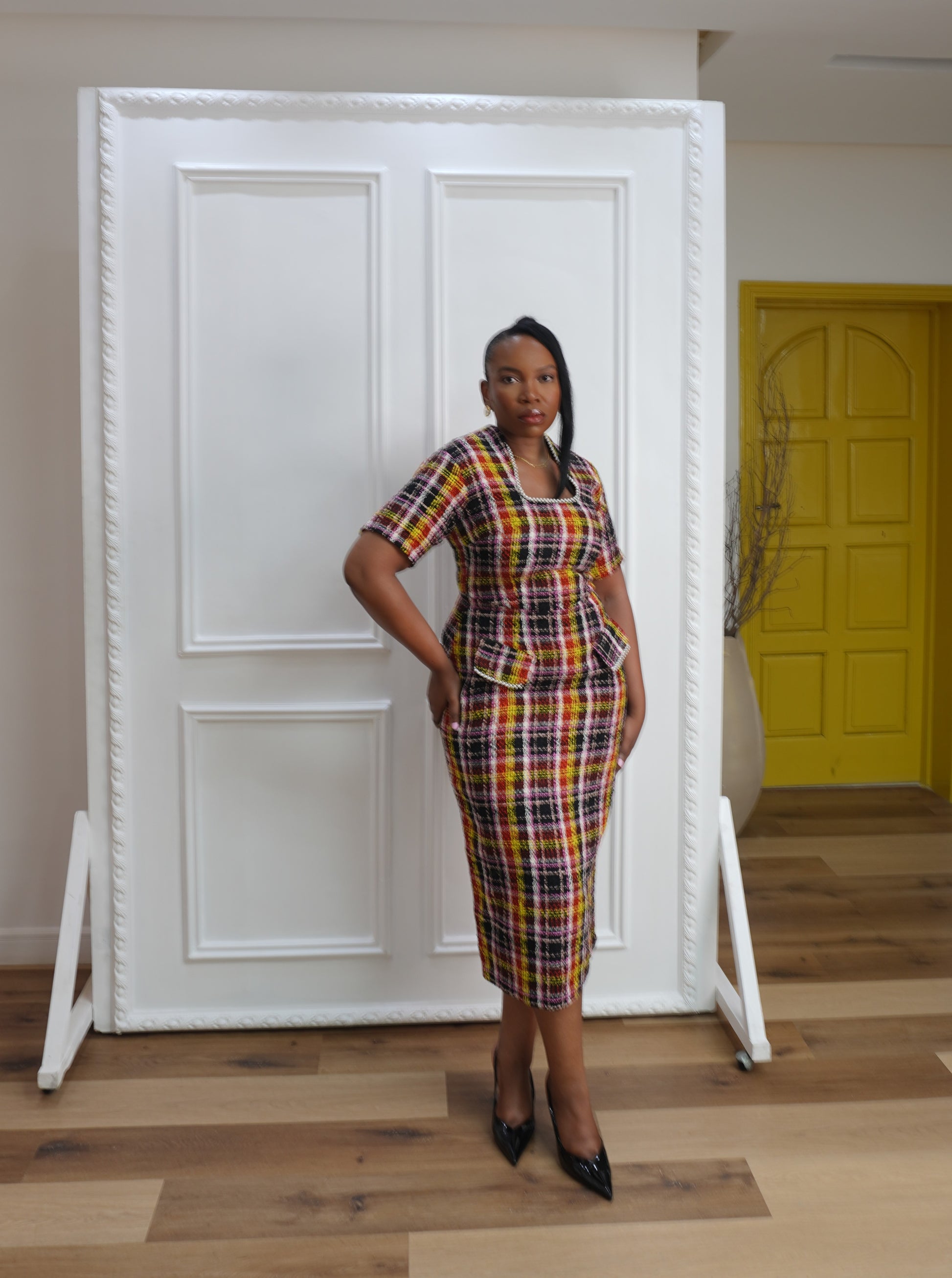 Uniquely designed tweed gown with embroidered pearl neck made for women who desire to make a statement while keeping it simple.